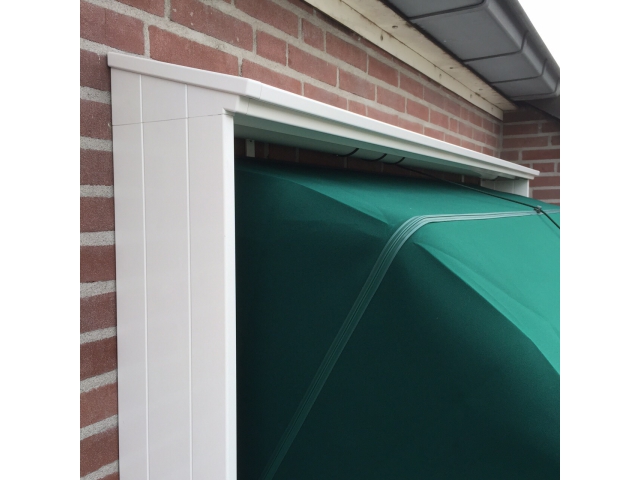 Bij koord bovenlangs keuze hangt het doek onder de markies in opgetrokken toestand los en beschermd een stormstrook of slijtlat de bovenste slag en voorkomt dat deze met wind tegen de muur slaat. Door het slaan tegen de muur kunnen er in de bovenste slag kleine gaatjes ontstaan. Dit voorkomt u met de stormstrook of slijtlat. Zonder stormstrook of slijlat kunnen wij geen garantie op het ontstaan van gaatjes geven